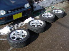 | タイヤ・ホイール(冬仕様 2) 2004.12.30 ガレージtakeにて。 満足度 ★★★☆☆ 長い間、前車BFのモノをそのまま使用していたのですが。 take号乗り換えにより、余剰品!?となったモノを譲って頂きました。 (どちらにせよ、いい加減今シーズンは買う予定だったのですが・・・) ![]() 交換直後に凍結路面でテストが出来る天候でした・・・ タイヤはの純正サイズのブリザックMZ−03 205-50-16です。 (これで、ローターを換えなくて済むようになりました) ![]() 某オークション風に言えば、バリ山の状態です。 ![]() ホイールナットが貫通タイプなのですが、締め味!?がすっごく良いです。 タイヤそのものは 2000年の45週と ちょっとばかり古いのですが、走行距離は5,000km弱であるということと、 かなりの安価で譲って頂けたというのが、決め手となりました。 (おまけ→スリットローター (笑)) ![]() 噛んでますねっ。(笑) ホイールそのものは無名のセットモノらしいのですが、 何故か自分のクルマに(デザインが)合っているような気がします。 正直take号よりも・・・ ゴムの劣化状況を考えると、ブラックアイスの路面は?? かも知れませんが、関東近県に行く分には問題はあまりないと 思っています。 (装着翌日にも雪が降ったので、早速役にたっています) ![]() いちおうデザインマッチングをっ・・・(リアが落ちているのは、タイヤが1セット入っているからです) |