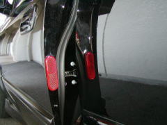 | ドア小口のリフレクター 2001.12 上記の作業で剥がしたものの有効利用!? 満足度 ★☆☆☆☆ まず、もともと貼ってあった両面テープを新しいものに貼りかえました。 そして、脱脂後貼りつけました。 ![]() 新しく貼った、3Mの両面テープ(一応、一流品ということで・・・) ![]() 安全の為ということで、この位置に貼りましたが、リアのドアと擦れることが判明し 後日、更に上部に移動いたしました。 (*_*) 他にも、(後部ドア、リアゲート)ちっこいのが貼ってあります。 ![]() リアのドアです。 ![]() ハッチゲートです。 |