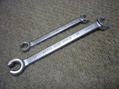 フレアナットレンチ (Snap-on) やはりこれも御徒町にて買いました。 RSXSM10A の10mmといいます。 ラチェッティングエンドとのコンビになっていて、 キツい時はフレアナットレンチで、緩んでビミョーにキツい時は ラチェッティングエンドの方を使えます。 どうせ自分が乗るようなクルマは10mmしかないでしょうし、 ネプロスは片側が使えなかった(レガはホースが太い!?)ので これにしたという経緯もあります。 ![]() 10mmです。 問題点としては、この先自分がこれを使用する機会が どれくらいあるのか・・・ということでしょうか?? まさに盆栽化するような気もします。 まぁ、同時に2006年のK○Cのカレンダーも頂いたので 良しとしようと思います。(意味がわからない・・・) (051227) |