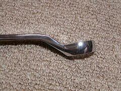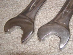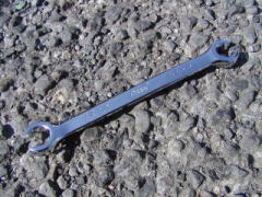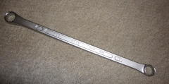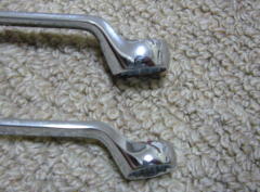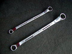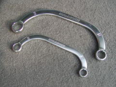 ハーフムーンレンチ (ストレート) 元々は届かないところに、この曲がりがビミョーに効くところに使うようです。 R32スカイラインのエキマニなんかはいいらしいです。 ・・・自分のクルマに必要かというと・・・ (-_-;) なぜか買ってしまいました。 使用頻度は非常に低そうです。 「ストレート」(東京足立店) にて ![]() 下のが10-12mm 上のが14-17mmです。 ![]() 14mmどうしでの、メガネレンチとの比較です。 (050717) |