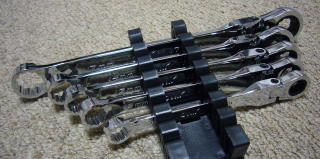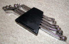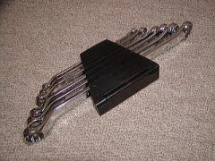 レンチホルダー これは USAG のホルダーです。 御徒町で買いました。 プラスチック製ですが、そんなに硬くないので 薄めのレンチでしたらぴったりと入ります。