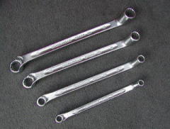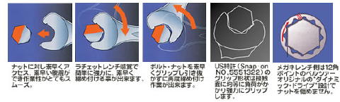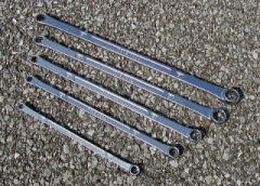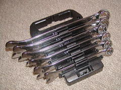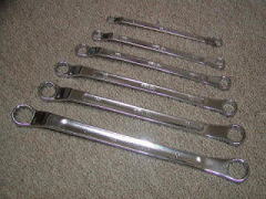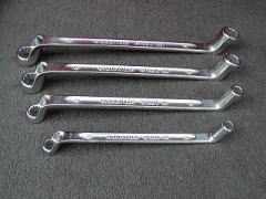 メガネレンチ (KTC プロフィットツール) 私がリンクを貼らせて頂いている、matsuiさんのhpに掲載されていて、 「一目惚れ」してしまったメガネレンチです。 どこに惚れたのかといいますと・・・ 普通のメガネレンチは、左右でサイズが違うものですが、 これは左右共、同サイズでかつ角度が違うという、 「現場の声」を元にして造ったモノだというところです。 (こういう製品って、シブくて!?好きなんですよね〜) たしかに 「ええっと、12mm・・・」 といった作業をしているときは 10mm か 14mm (普通、組になっていますよね・・・)は不必要で あとは12mmの使いやすさだけを考えると思います。 そういう時は、非常に具合がいいようです。 また、ちょっと細目(薄め)に造ってあるようで、 作業性>耐久性 という設計コンセプトのようです。 ![]() 上から、8,10,12,14,17,19mmです。 19mmだけ入手経路が違うので、刻印が異なります。 (たぶん、モデルチェンジをしているみたいです)