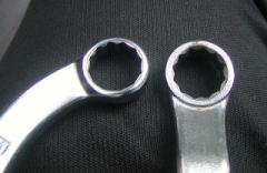 ・・・ということで、 メガネレンチの曲がり について 比較してみました。 一応、17mmのレンチで比較しています。 ![]() その1 (上部から見た絵です。) 上から、TONEのロングストレートメガネ(0°) SANKIのメガネレンチ (45°) スタビレーのメガネレンチ (75°) KTCのプロフィットツール (45°の方です) ![]() その2 横から見た絵です。 やはり上から、TONEのロングストレートメガネ(0°) SANKIのメガネレンチ (45°) スタビレーのメガネレンチ (75°) KTCのプロフィットツール (45°) KTCのプロフィットツール (すうっと15°(笑)) (参考 ・・・サイズ違いの14mmです・・・) 同じ45°とはいいながら、SANKI と プロフィットはかなり違いますし (一般形状に近いのは SANKI の方だと思います) 各メーカーさんの、いろいろな思想が見てとれて面白いです。 (というより、あえて角度の違うものを揃えていった、 ということなんですが・・・) 要は 使いやすければ いいのでしょうが、 いろいろ試してみたいと思います。 |